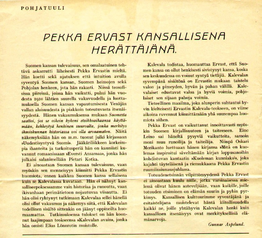 | Nimike | | | 1913 Väinö Valvanteen kuvaus P.E.:stä Teosofian Valo -lehdessä |  | | 1917 Sven Krohn: Tunsin Pekka Ervastin |  | | 1925 Sven Krohn: Erään tietäjän elämä |  | | 1937 Pekka Ervast and Theosophy in Finland |  | | 1957 Yrjö Kallisen ensimmäinen P.E:n tapaaminen ym. |  | | 1989 Torsti Lehtisen runo P.E.:stä |  | | 2014 Pentagrammi-lehden artikkeli P.E.:stä |  | | 2014.09.25 P.E. kansainvälisellä teososofisella keskustelufoorumilla |  | | Pohjanttuli, Gunnar Aspelund: Pekka Ervast kansallisena herättäjänä |  |
