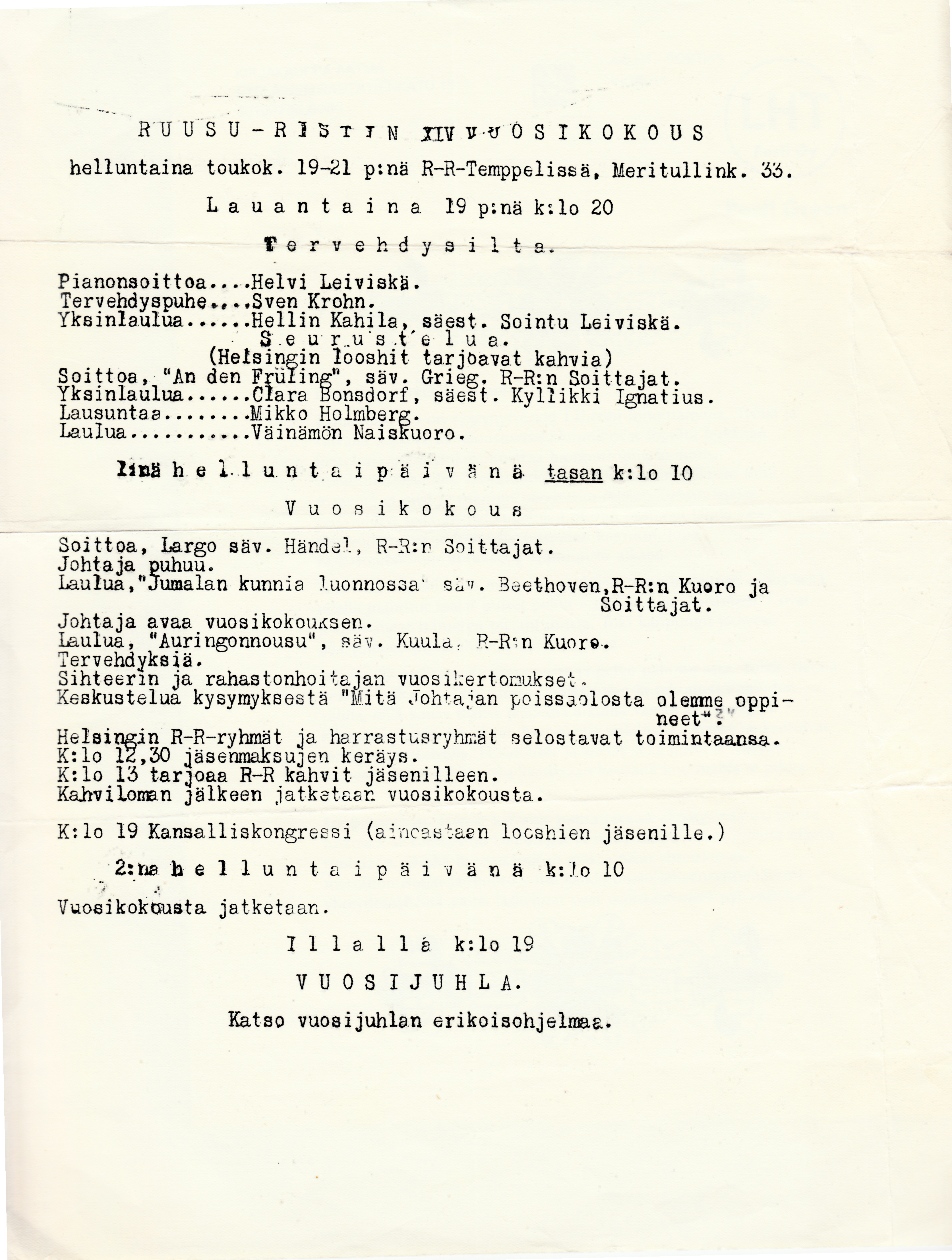 Ruusu-Ristin Juhla Viipurin Teatteritalolla maanantaina 18 p:nä helmikuuta 1929